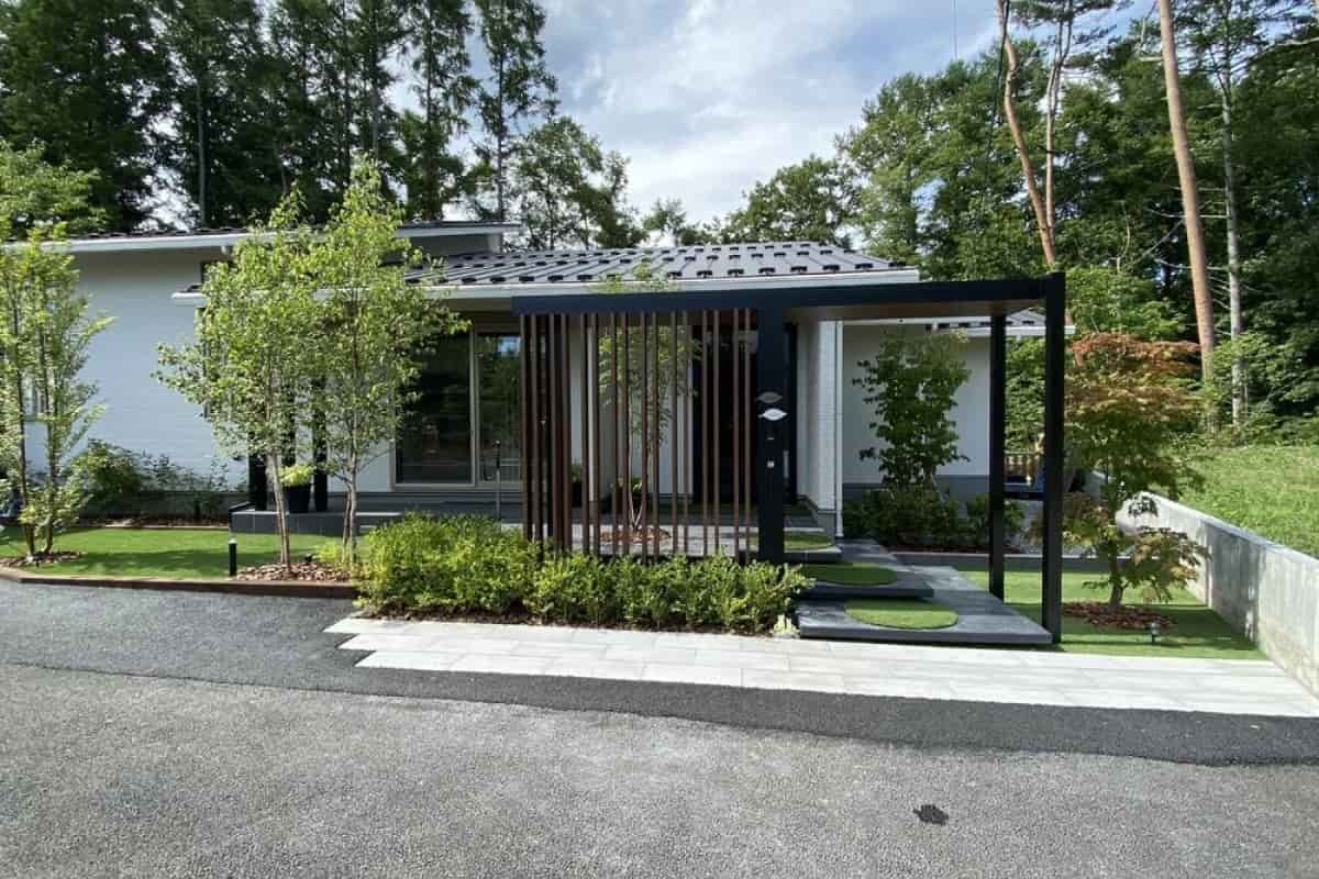 住宅のファサードと玄関先のアプローチが、洗練されたお庭の魅力を引き立て、白と黒の対比を緑の植栽が一層際立たせます。