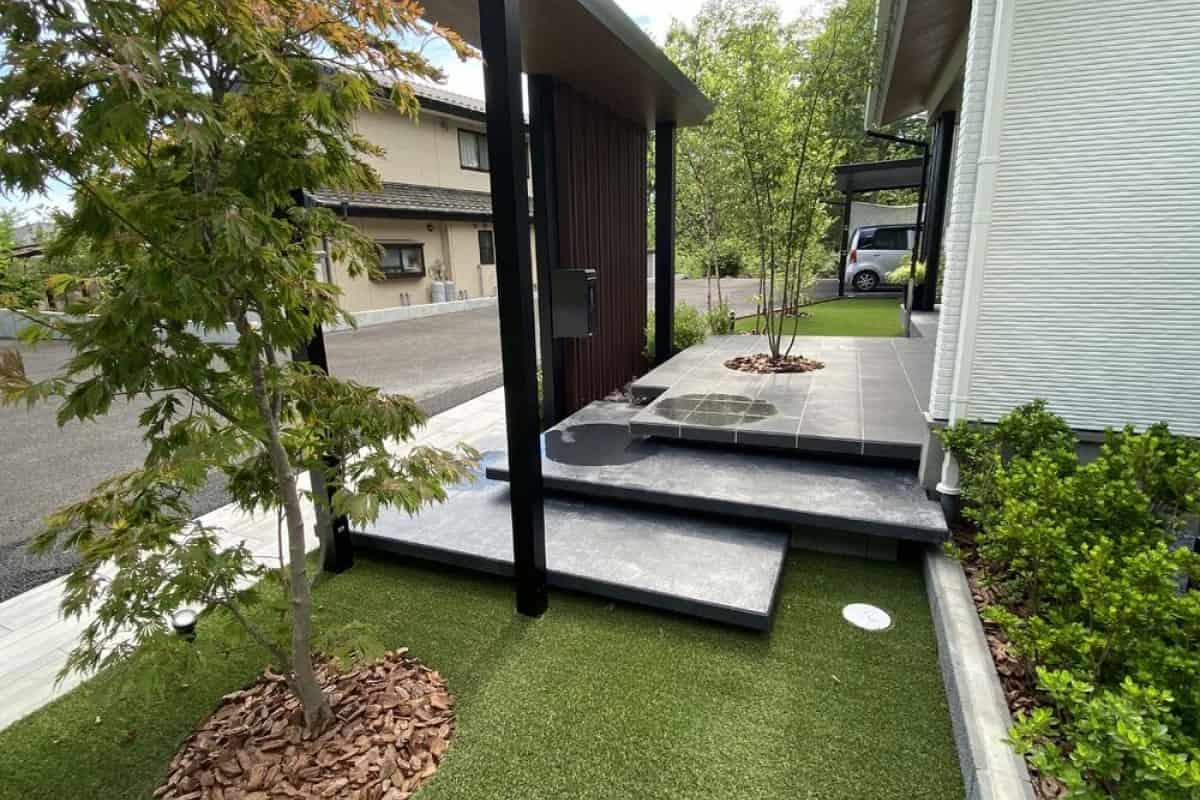 最上段のステップを玄関と一体にすることで、費用を節約しつつ玄関周りの雰囲気を揃えています。また、他のステップが違う素材を使用し、家全体にメリハリを生み出しています。
